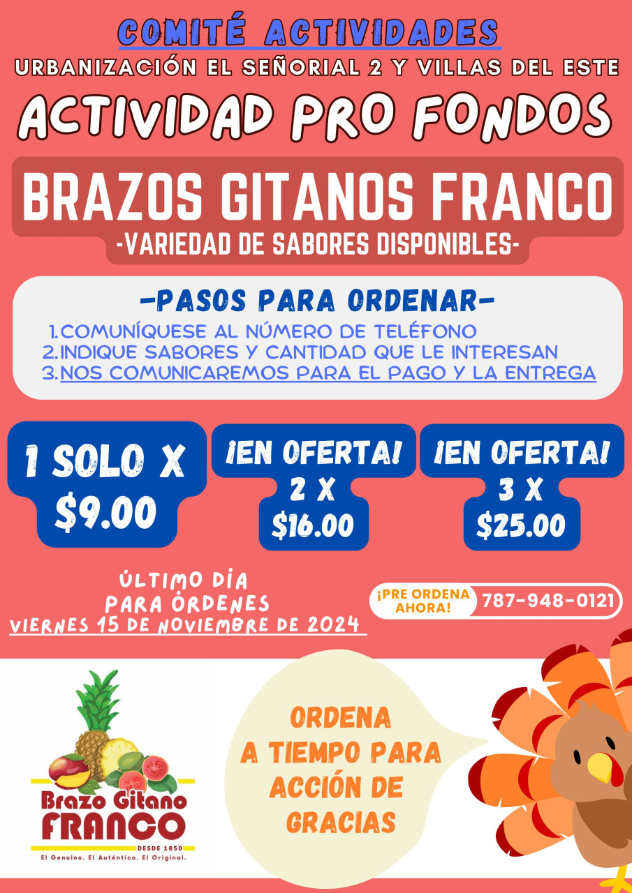 La Junta Directiva de la Asociación de Residentes ESSSVE Inc., invita a todos los residentes a participar de actividad pro fondos "Brazos Gitanos Franco."