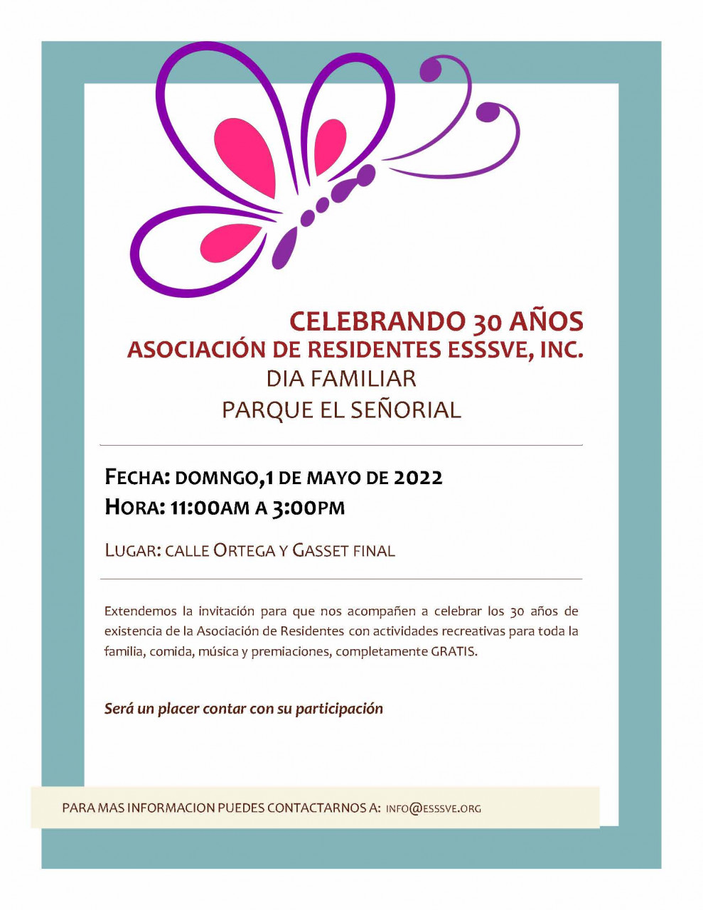Extendemos la invitación para que nos acompañen a celebrar los 30 años de existencia de la Asociación de Residentes con actividades recreativas para toda la familia, comida, música y premiaciones, completamente gratis.