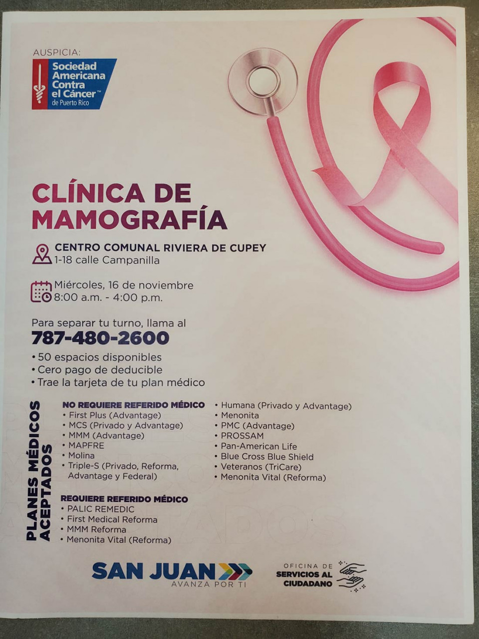 El Municipio de San Juan y la Asociación Americana del Cáncer te invitan a la clínica de mamografia.