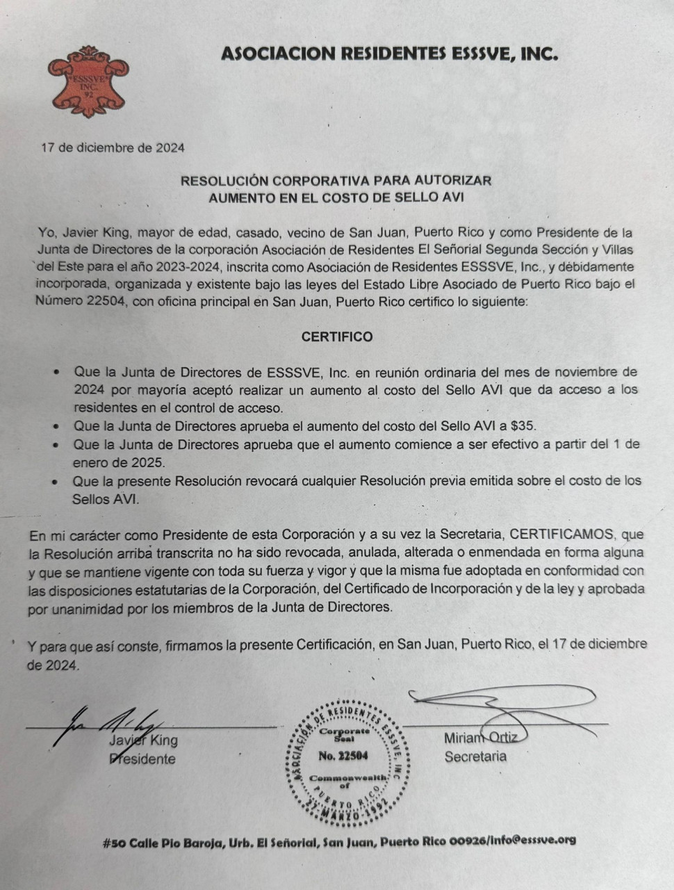 La Junta Directiva de la Asociación de Residentes ESSSVE Inc., ha publicado la siguiente resolución.