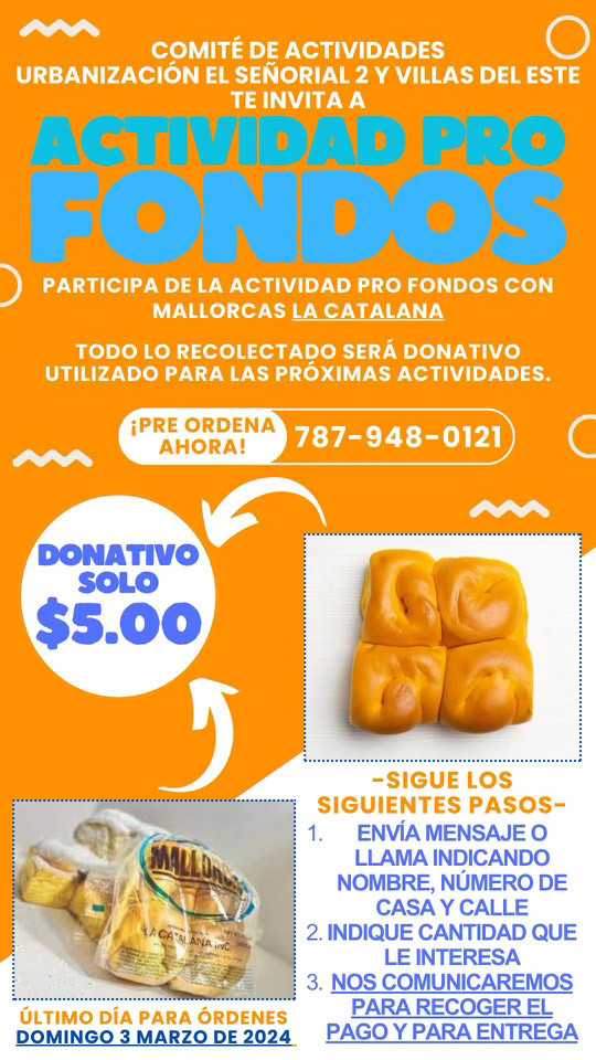 El Comité de Actividades de la Urbanización El Señorial 2 y Villas del Este te invitan a la preventa de Mallorcas La Catalana. Todo lo recaudado será donativo utilizado para las próximas actividades.
